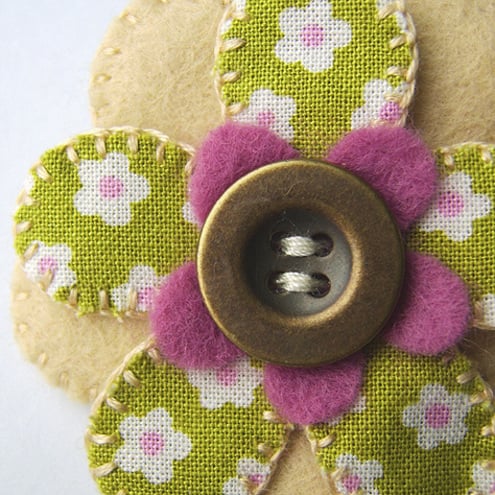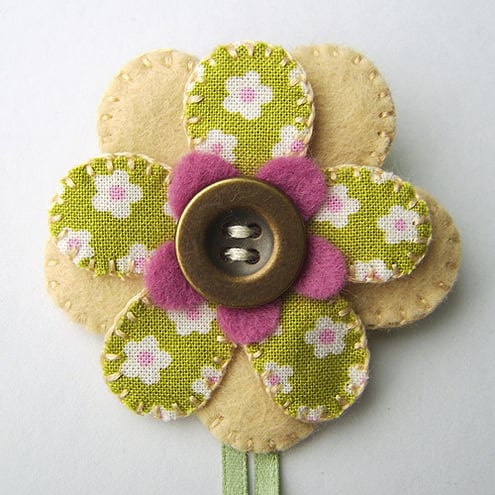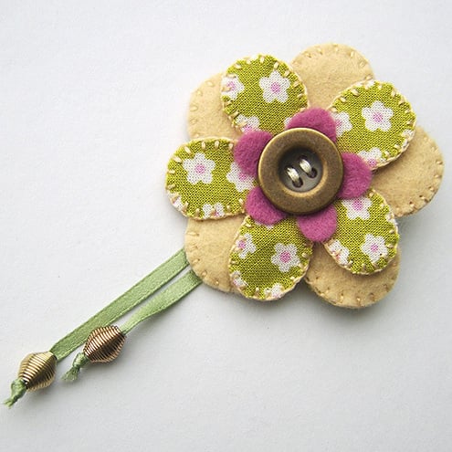 A lovely handmade fabric brooch, featuring layers of felt and cotton print petals in beautiful shades of soft creamy yellow and spring green. Finished with a button centre and a hanging ribbon and bead detail. Brooch backing on reverse side for easy attachment.