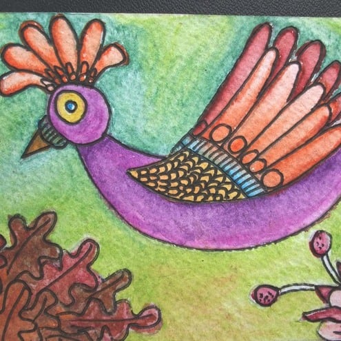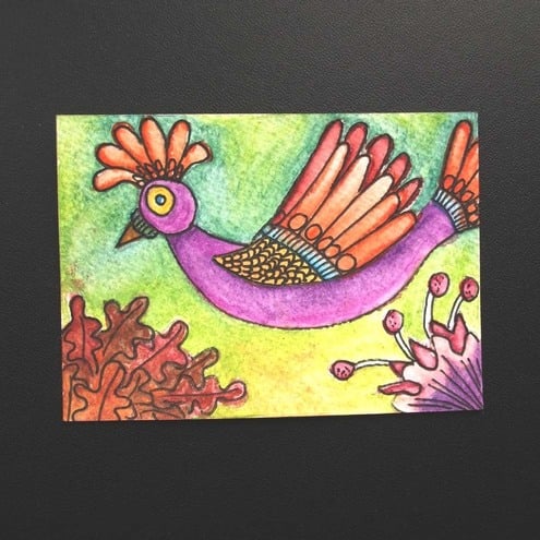 This is a tiny little ACEO original watercolor painting of an exotic bird in flight.