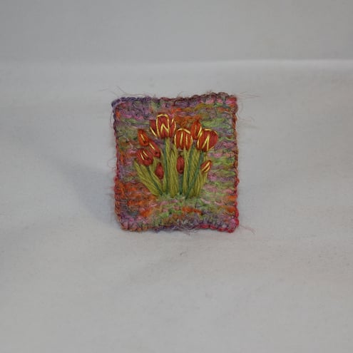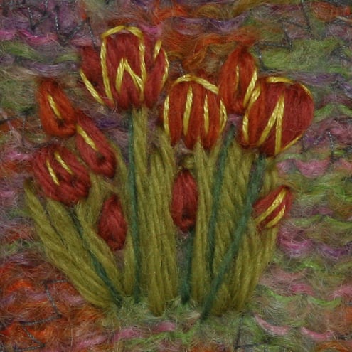 Tulips stitched in tapestry wool, against a background knitted in mohair yarn and felted, form the design for this spring brooch.