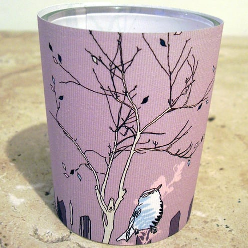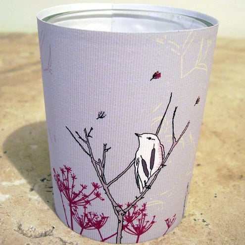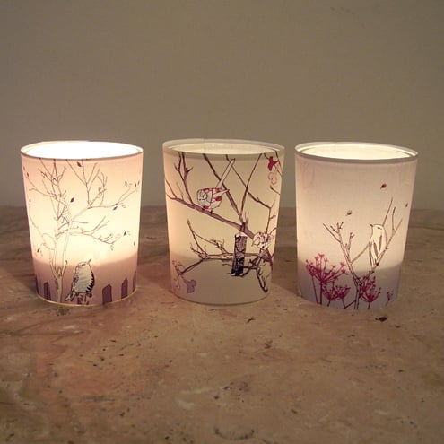 My original littlebirdy designs have been printed onto fire retardant, washable fabric which is then wrapped around a glass tealight holder.