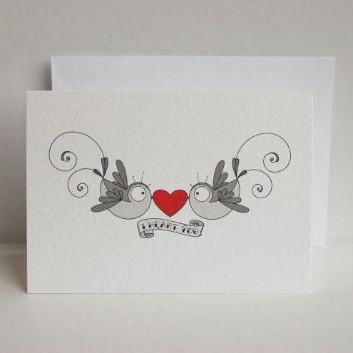 unique and quirky illustrated card, featuring a pair of retro "tattoo style" swallows, holding a love heart. the scroll underneath reads: "i heart you".