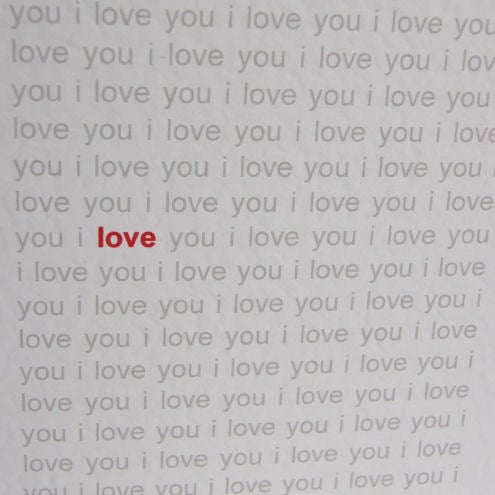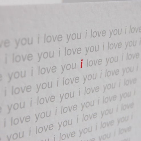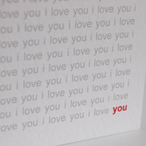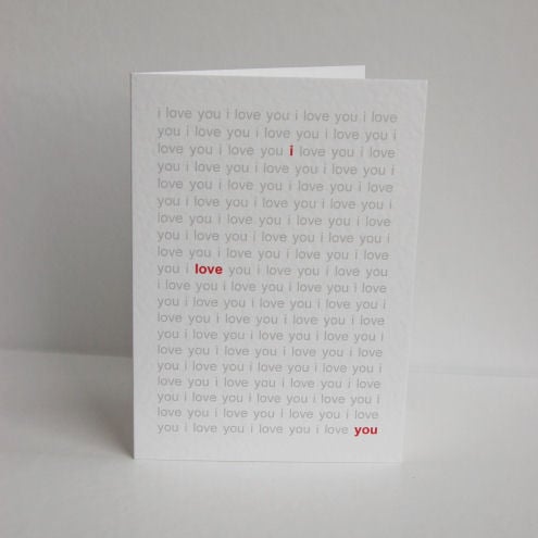 this card is printed all over with "i love you" in grey text, with each word picked out once in a contrasting dark red. just to get the message across!