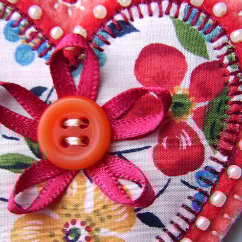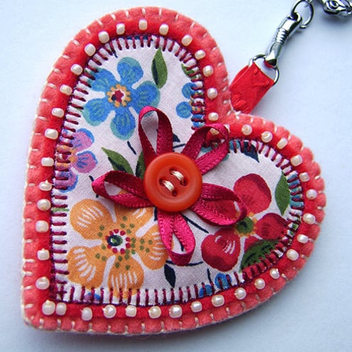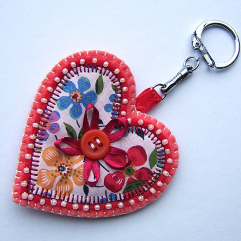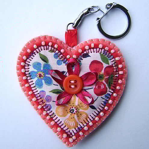 It features an appliqued Liberty print fabric heart backed with red felt. It is beautifully edged with beads and finished with a button and ribbon detail and is backed with coordinating felt. Complete with a metal key ring attached.
