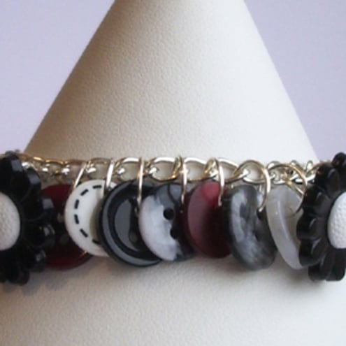 This distinctive button charm bracelet rich with an assortment of black, white, pearlescent, red, grey and silvery buttons, features four black daisy buttons.