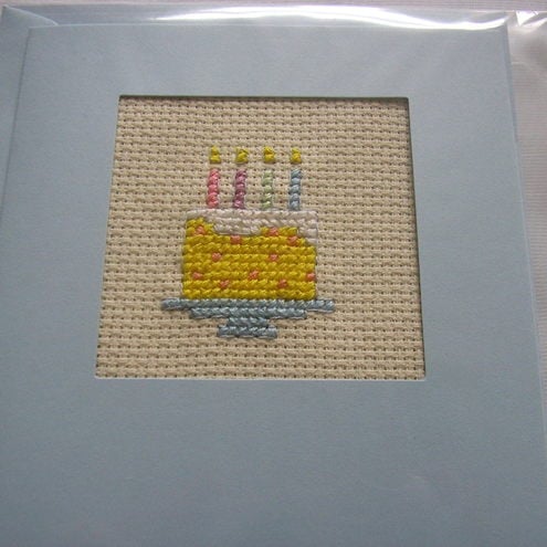 Beautiful, sweet, blue Happy Birthday card. Hand sewn by me, showing a lovely colourful birthday cake. Silver happy birthday sticker and 5 kisses.