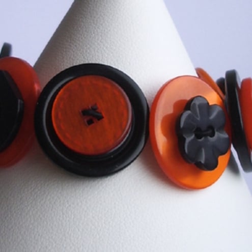 This distinctive button bracelet is rich with an assortment orange and black buttons. These are threaded onto jewellery wire, which secures at the end with a silver plated lobster clasp fastener.