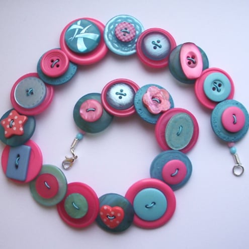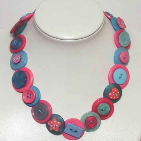 This distinctive button necklace is rich with an assortment of hot pink and aqua buttons. These are threaded onto jewellery wire, which secures at the end with a silver plated lobster clasp fastener.