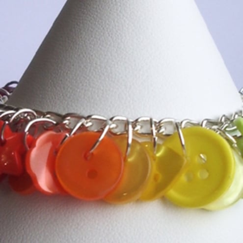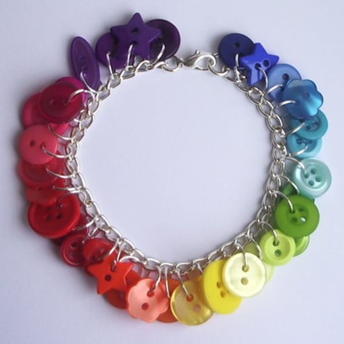 This distinctive button bracelet is rich with an assortment of buttons of all the colours of the rainbow.