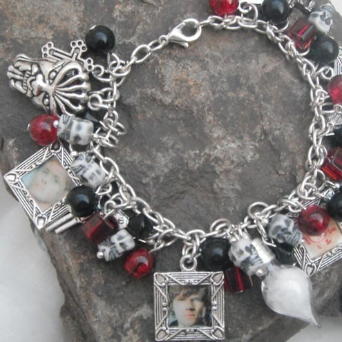 Finished with red crackle beads, black pearls, red glass cube beads and black bicone beads, with acrylic skulls for that added Gothic look!