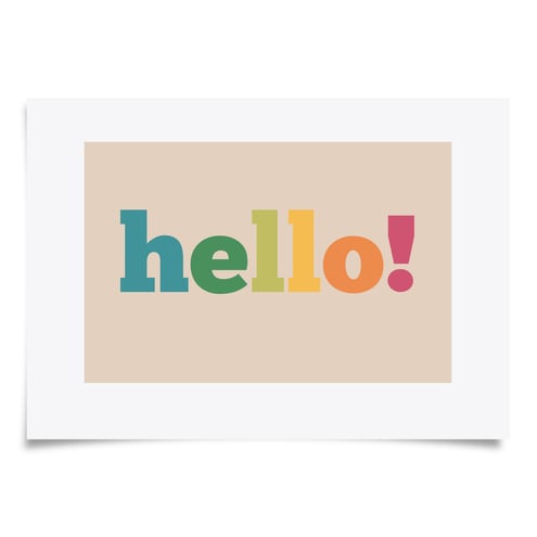 hello! Simple A5 print of one of the world's most recognisable words. I love this print, it makes me smile. Beautiful muted brights on a natural background. This print looks wonderful when framed, and will fit a standard IKEA Ribba frame.