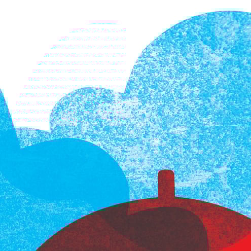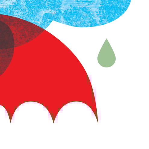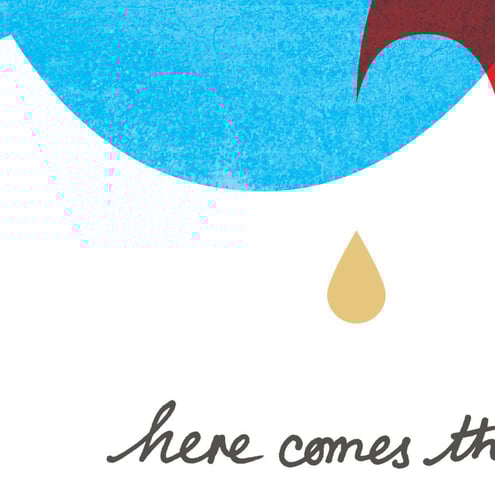 Lovely textured cyan clouds drop juicy coloured blobs of rain onto a small red umbrella. Forget about everything, go out and splash in those puddles! This print looks wonderful when framed and will brighten any wall.