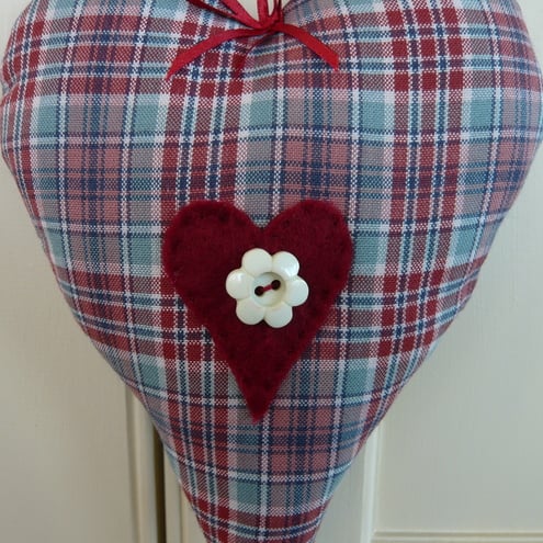 This is probably best described as a maroon/white/blue check material. Sewn on the front there is a maroon red felt heart with a cream flower shaped button and then finished off with a thin ribbon.