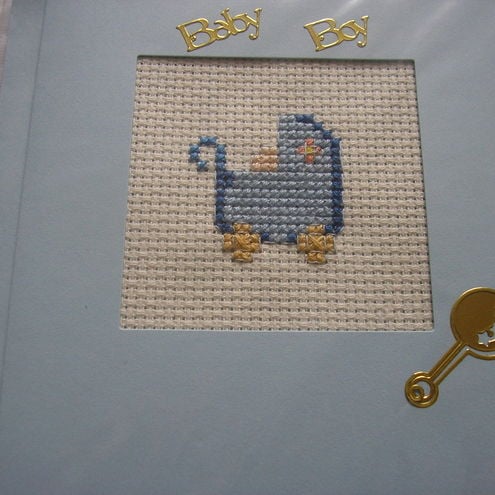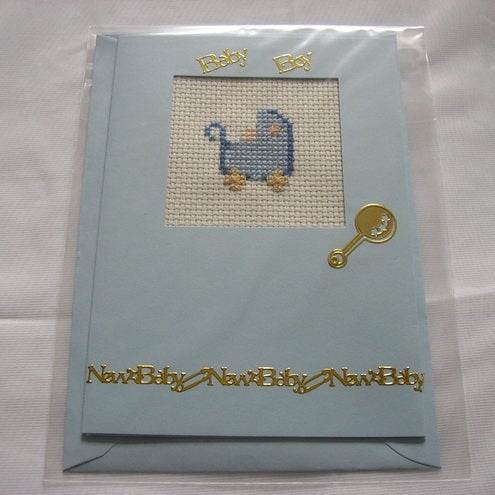 Beautiful, sweet, blue New Baby Boy card. Hand embroidered by me, showing a lovely old fashioned pram. Stickers for new baby, baby boy, nappy pins and baby rattle.