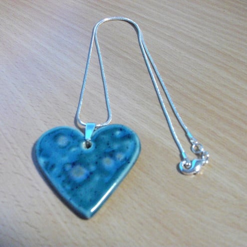 This Large Ceramic Heart Pendant hanges from a sterling silver pronged bail and sterling silver 18 inch snake chain. Blue with burst of green crystals.