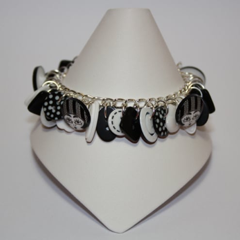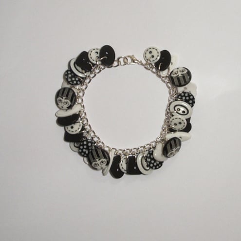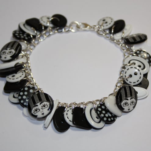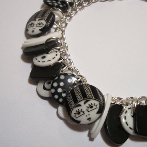 This distinctive button bracelet rich with an assortment of black and white buttons, features four flapper girl buttons.