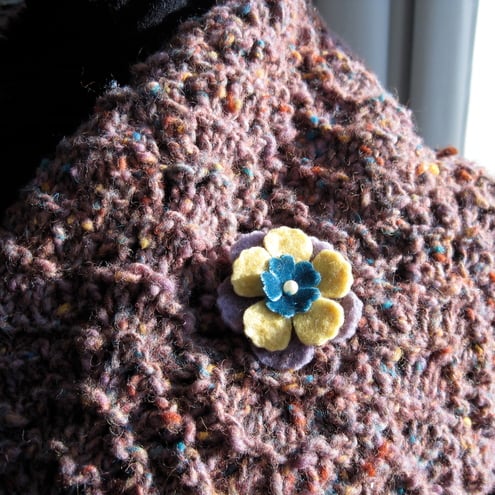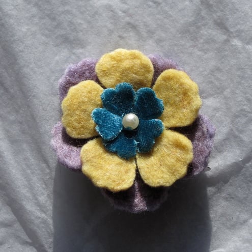 Made from felt and pressed velvet flowers and with a pearly bead in the centre and silver coloured safety brooch pin stitched to the back.