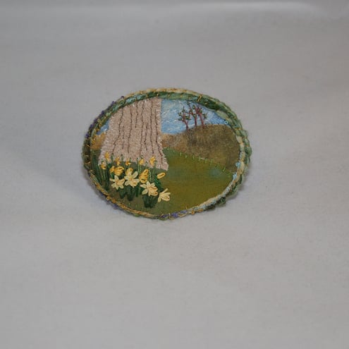 Embroidered daffodils form the focus of the spring scene on this brooch.