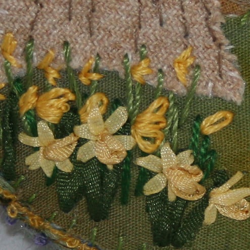 The background of the brooch has been hand appliqueed, with details added by embroidery. The daffodils have been added in the foreground. Those at the back of the group are worked in a fine thread, those in the centre in several strands of embroidery thread and those in the front are stitched in silk ribbon - this gives depth to the design. Two rows of couching over a mixed greens and golds yarn frames the design.