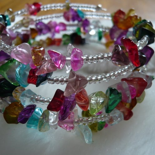 This lovely cheerful bracelet is made with lots of different coloured glass chip beads and silver lined seed beads. There are 5 coils to the bracelet which shows off all colours.