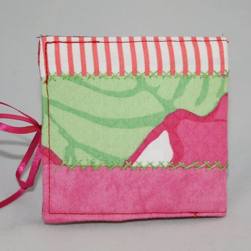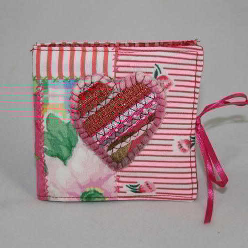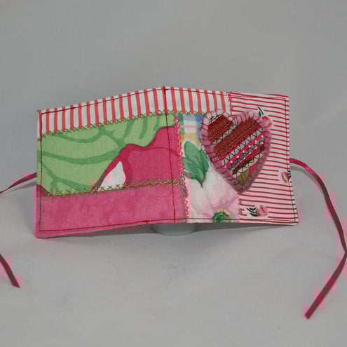 Two pieces of patchwork are combined in the design of this bright and cheerful needlecase. The body of the needlecase is produced from a patchwork of pink-themed fabrics, embellished with hand embroidery in bright pink and green embroidery threads. The heart motif is cut from a piece of strip patchwork, produced from ribbons and embellished with couched ribbons and yarns. The motif is placed on the front of the needlscase and framed with couched yarn in shades of pink and grey.