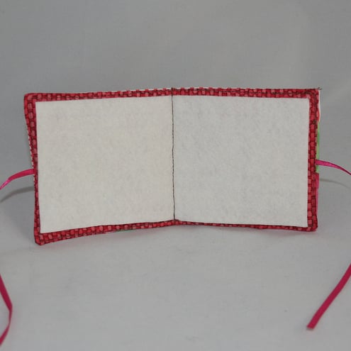 The case is lined with a pink patterned fabric. Two felt pages are stitched in place to hold your pins and needles. The cover of the needlecase is stiffened with pelmet-weight interfacing to offer protection against any protruding needle points.
