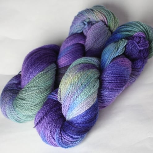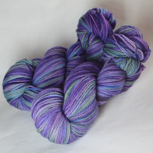 Shades of green with violetty-purples, blue, tealand hints of pink and olive. These are a big, squashy, soft skeins of two-ply merino sport/sock yarn - despite its huge appearance it works up as a thick-ish sock yarn. The yarn has been reskeined as shown in the first two photographs, but is shown in the third photo before reskeining, for reference only. There is one skein left - the remaining skein is the one on the left in the second photograph.