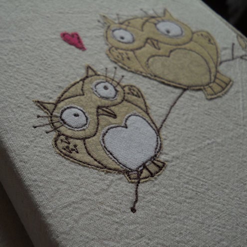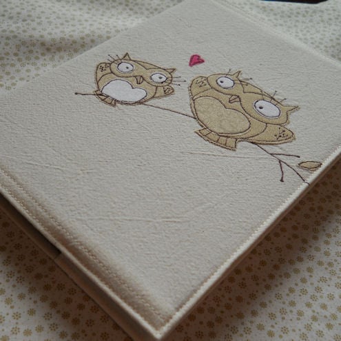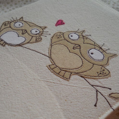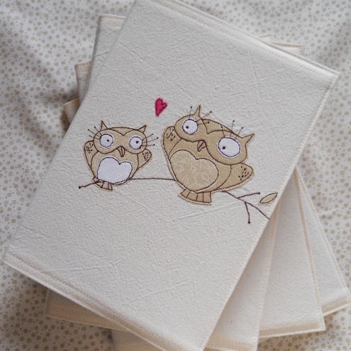 this embroidered notebook features a pair of cream coloured owls on the front cover.