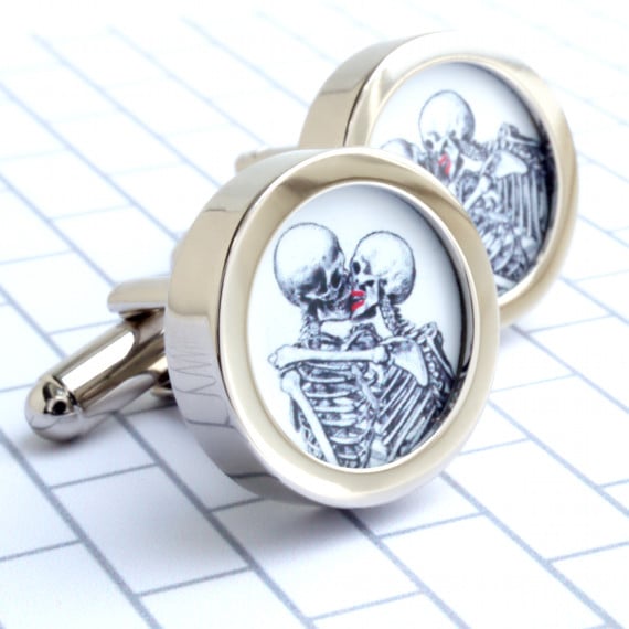 Two skeletons kissing make an interesting and unusual pair of cufflinks. The eternal love story of boy meets girl, boy kisses girl, and they both live happily ever after - even skeletons need to be loved.