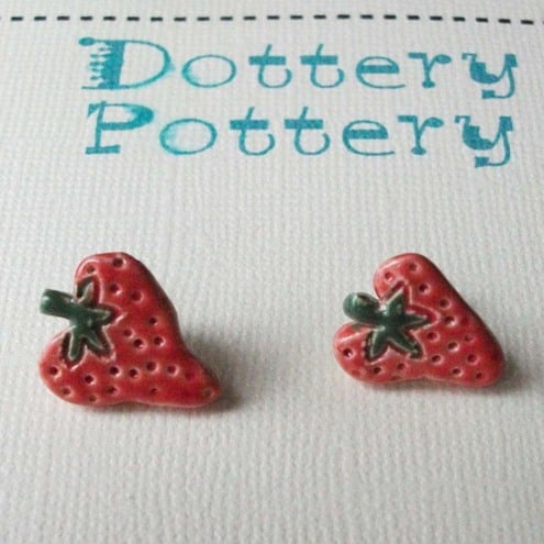 These little strawberry studs are made from white earthenware clay and decorated with brightly coloured glaze.