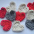 Each lovely heart is made from 100% soft cotton and is just under 3" wide and high. They are filled with the same colour filling as the yarn, so there are no white bits showing through!