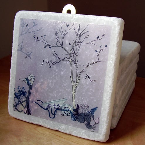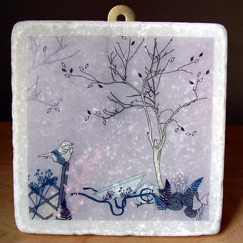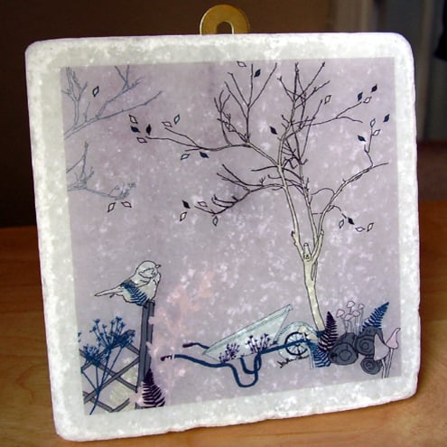 white marble tile featuring an original 'littlebirdy' design to hang on your wall!