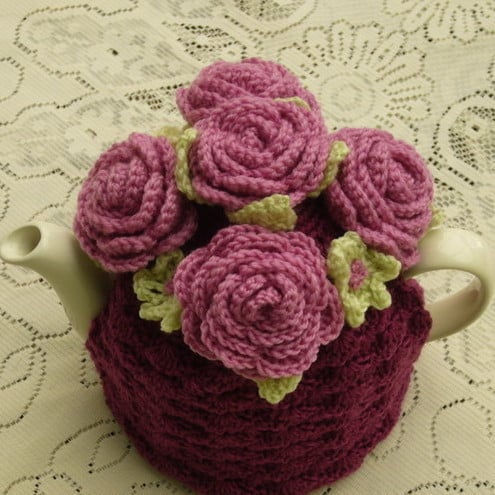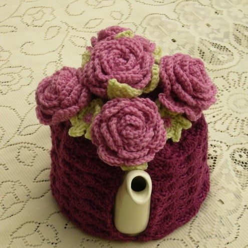 The cosy has been handmade using good quality yarn in plum. The top of the cosy is decorated with five individual roses in pretty pink with pale green leaves. Around the edges of the roses are four little flowers in pale green with pink crochet bobble centres.