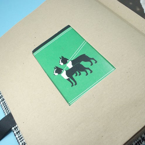 The inner book pages are made from folded recycled kraft paper previously used to wrap a parcel (the paper is slightly marked and crumpled in places). The front and back pages are covered with vintage tweed material and embellished with a Scottie that I cut from old felt. Black ribbons are attached to tie the book flat when not on display.