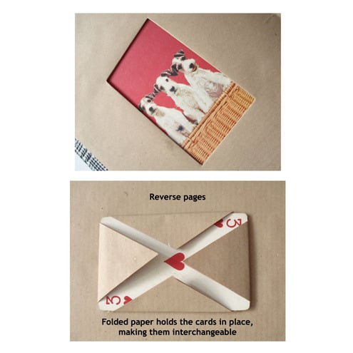 I felt my entry had to be dog related and so I made the photo book to display some of my very favourite vintage dog playing cards and postcards by cutting apertures in the paper and then using folds to hold the cards in place. Since no glue is used, this means that the cards are interchangeable for other similar sized photos, postcards, playing cards etc.