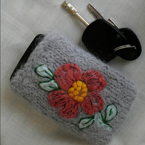 A pink dog-rose has been embroidered onto this cosy before felting to give a closer texture and provide more protection for your ipod, phone etc. The stocking stitch base for this design results in a cosy which is still slim enough to cary in a pocket.