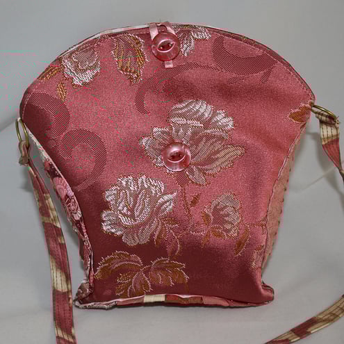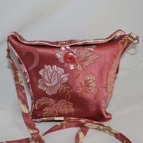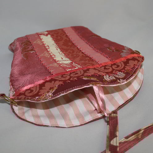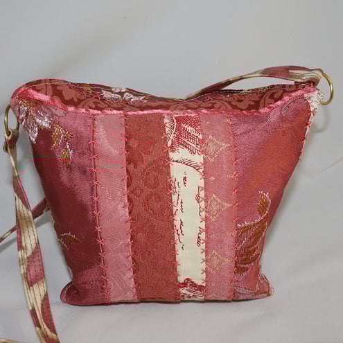 The front panel is formed from strip patchwork chosen to compliment the main brocade fabric. The seams are embellished with hand embroidery in pink embroidery thread. Pink satin ribbon provides further embellishment. The back of the bag is formed from the vintage brocade.