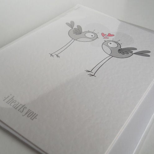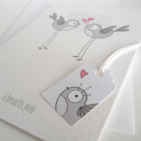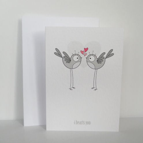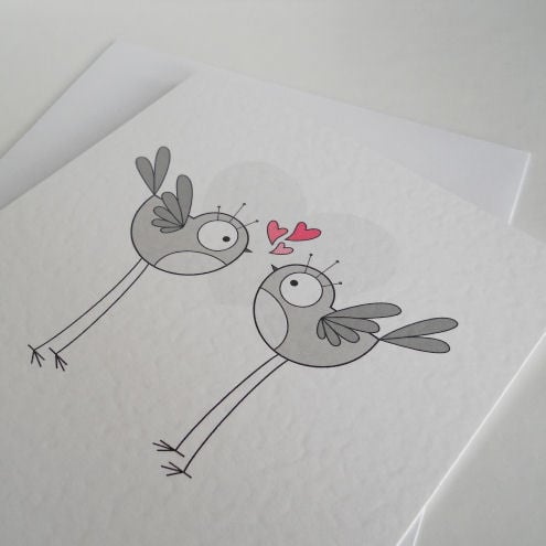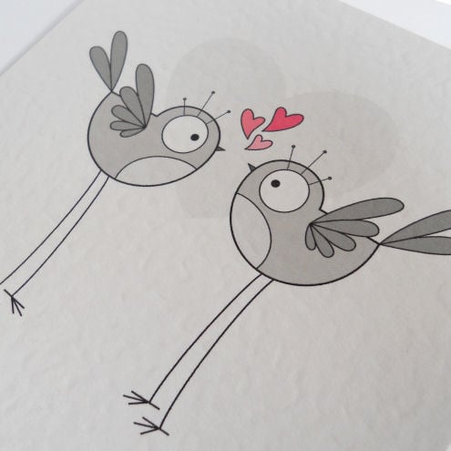 unique and quirky illustrated card, featuring a pair of lovebirds who only have eyes (and hearts) for each other!