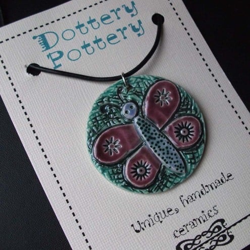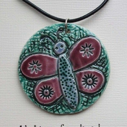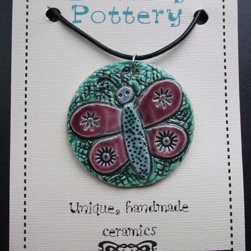 This butterfly pendant is made from white earthenware clay and fired to 1100 degrees.