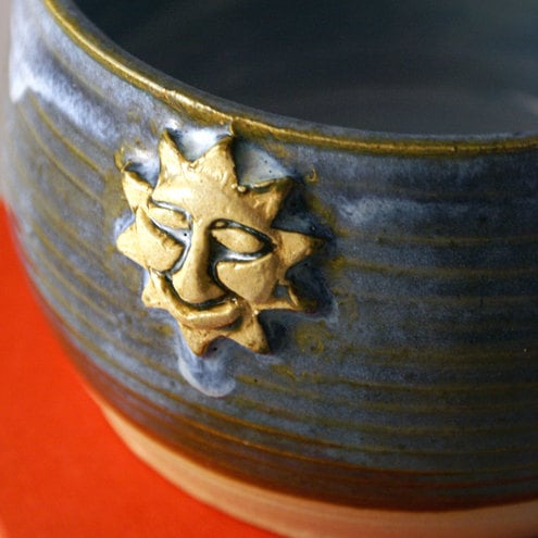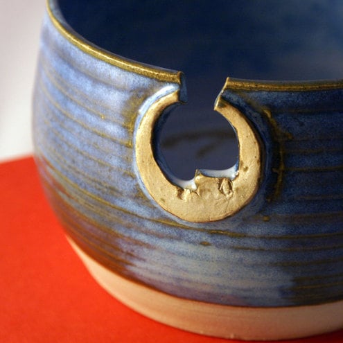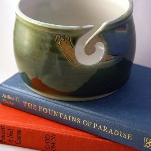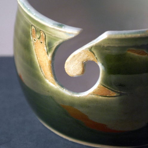 The blue yarn bowl features a celestial sun and moon, the curl for your yarn forms part of the inside of the moon. The green yarn bowl features a snail with a curling shell.