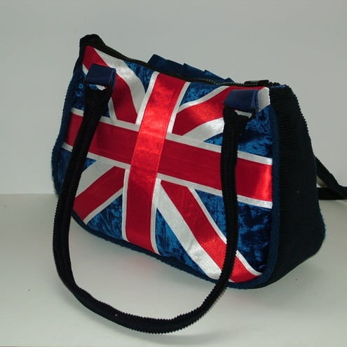 THE FRONT HAS A CRUSHED BLUE VELVET BASE, ON TO WHICH WHITE AND RED RIBBON HAVE BEEN LAYED TO CREATE A STUNNING UNION JACK.