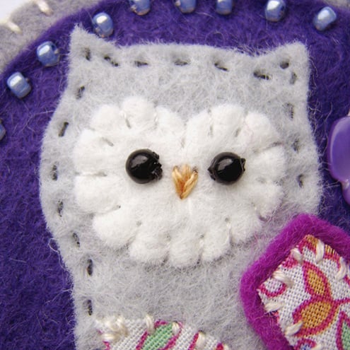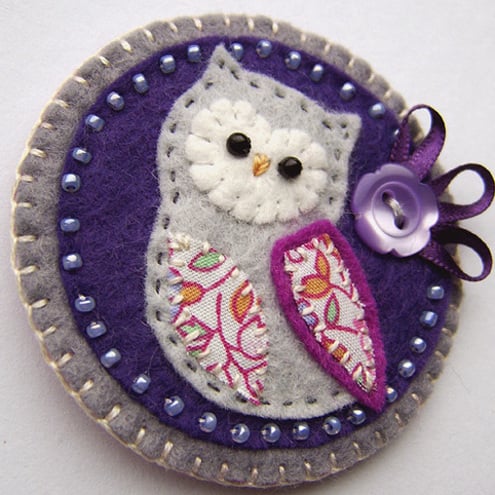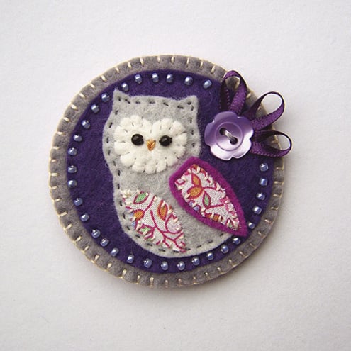 It features a little owl with appliqued wing and belly in pretty cotton print fabric. It is mounted onto a purple circular felt base which is edged with pretty coordinating seed beads. It is further mounted onto a grey felt backing and is finished with a flower button and ribbon detail. It has a brooch backing for easy attachment.