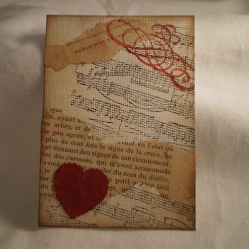 I have hand distressed the background to give a vintage feel, over stamped with music and a flourish. There is a small red heart punched from hand made paper and fragments of an antique french romantic novel, aged to perfection.
