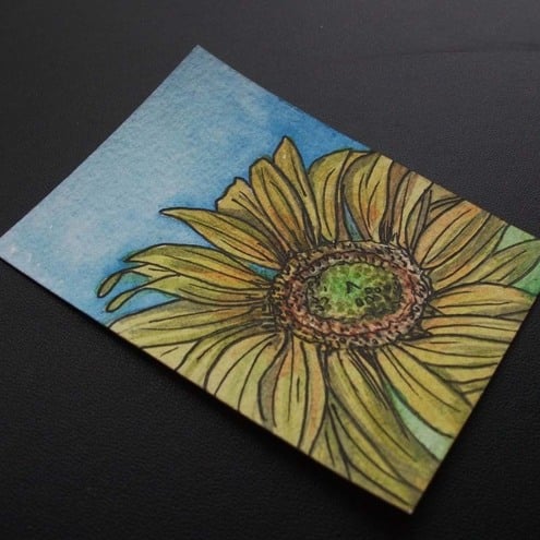 This is a tiny little ACEO original watercolor painting of a Sunflower