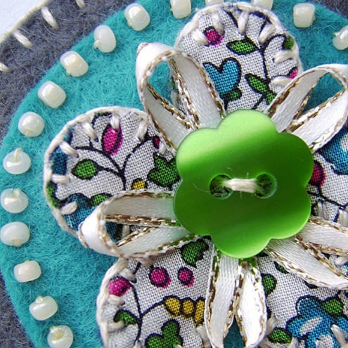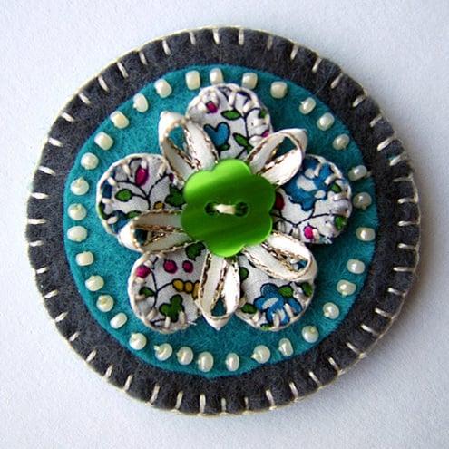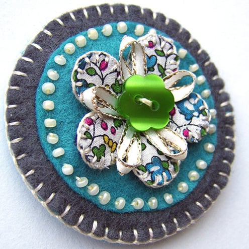 A cute little flower brooch. Featuring an appliqued flower design in pretty Liberty print fabric, mounted onto a turquoise felt base and edged with pretty cream seed beads. The flower is finished with a ribbon and button centre and is mounted onto a grey felt base. It has a brooch backing for easy attachment.