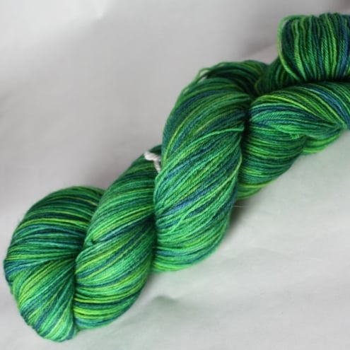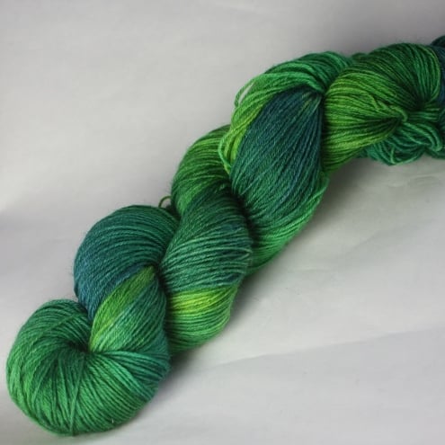 Lime, teal-green and emerald combine in this soft, slight lustrous sock/sport-weight yarn. It should make lovely socks, scarves, shawls or other projects requiring sock/sport or 4 ply yarn.