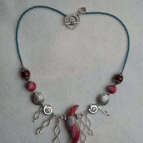 Polymer clay squiggle focal bead and 2 matching round beads handcrafted myself using leaf & flower canes in pinks, gold, lilac, blue, peach & natural colours. Teamed with an array of treasures including Karen Hill Tribe silver toggle clasp and dangly berry charms, Tibetan silver lentil beads, snails, flower spacers & bead caps and Swarovski crystals & pearls. This measures approx. 47cm long and comes in sparkly black box.