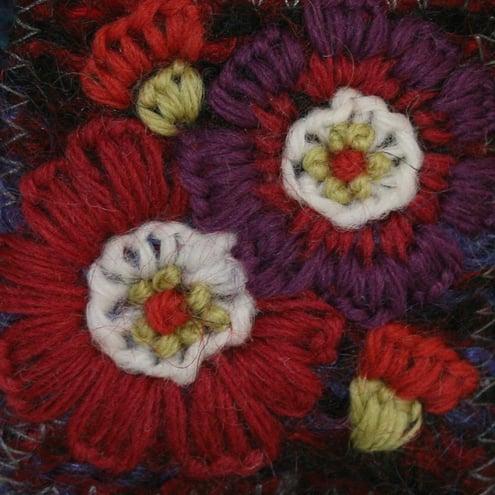 The background has been knitted in a mohair yarn in shades of purple and magenta and then fulled, or felted, to give a closer texture, This knitted background has then been machine basted to a thick wool fabric. The flowers have been embroidered using a combination of French knots and blanket stitch. The design is framed with a row of couching over a chenille yarn.