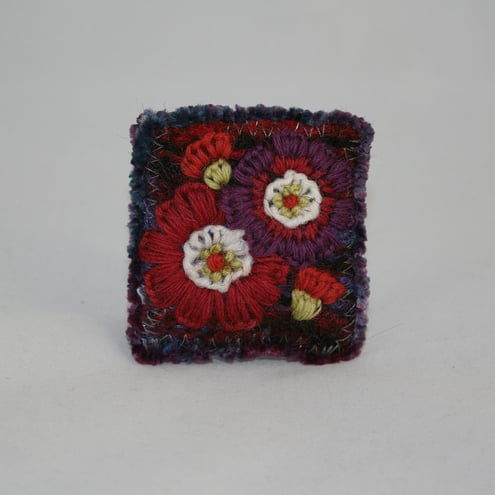 Bright and bold cineraria flowers are embroidered in tapestry wools, against a hand knitted and felted background, to form this pretty brooch.