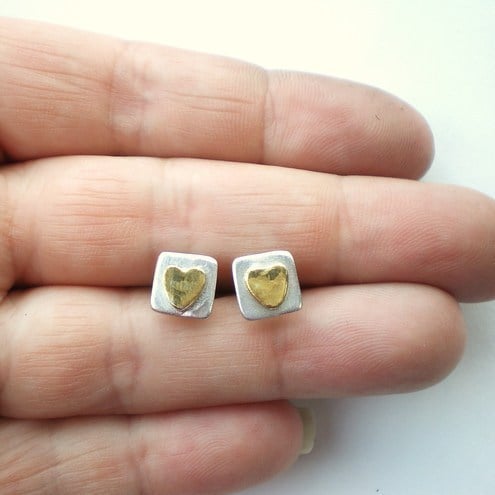 Really tiny silver square stud style earrings with a gold heart. The tiny silver squares measure 0.7cm x 0.7cm. The tiny hearts are fine silver with 24K gold applied to them using keum-boo technique.