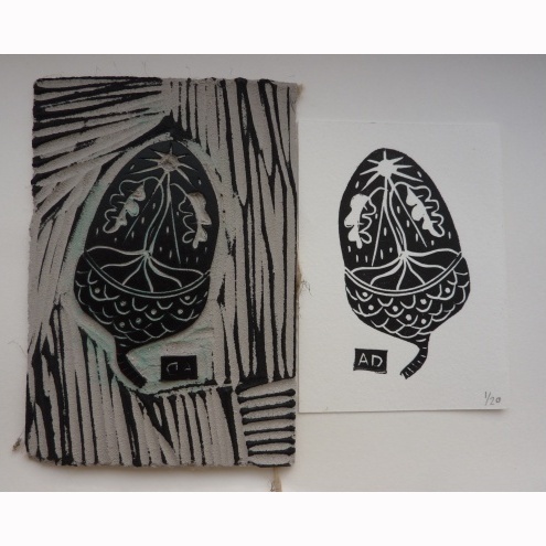 ACEO -sized lino print called "from little acorns".